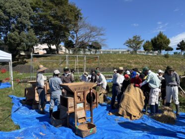 今日は、昔の道具(今も現役です)を使い、脱穀、とうみ、籾摺りを体験しました。